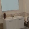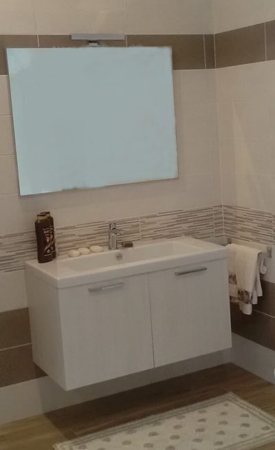 Mobile bagno bianco formato da: una base sospesa con 2 ante Leli mod. 5952 A; una consolle ESSEQ8771 in ceramica con vasca integrata centrale con troppopieno e foro rubinetto centrale (esclusa piletta); specchiera sospesa con profilo in alluminio mod. 6635, posizionabile sia in orizzontale sia in verticale, senza presa né interruttore; lampada a led cromata NEW mod. 6635 con fascia luminosa (alimentatore interno al supporto).