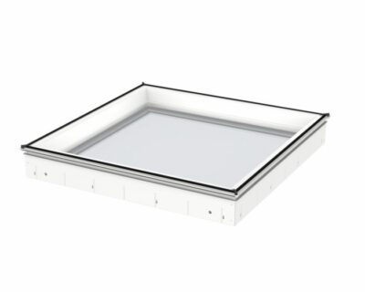 Finestra per tetti piani fissa CFU Veluxcon basamento in legno di pino stratificato ed isolata internamente con polistirene espanso sinterizzato, con rivestimento in poliuretano bianco e doppio vetro stratificato antieffrazione. Da completare con finitura esterna a scelta tra vetro curvo o vetro piano (da ordinare separatamente). Consigliata l’installazione di profili blocca guaina (da ordinare separatamente).