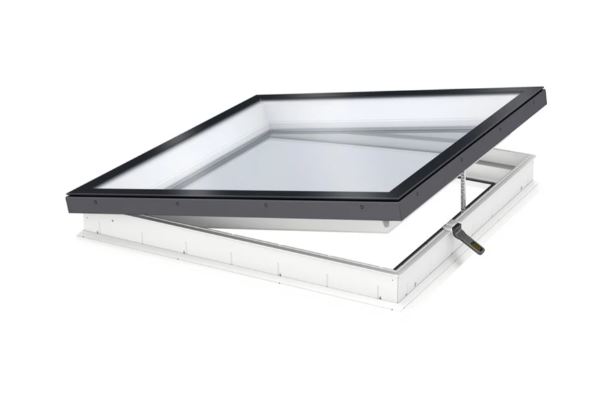 Finestra per tetti piani INTEGRA CVU con basamento in legno termotrattato e rivestimento in poliuretano bianco, con triplo vetro stratificato di sicurezza.