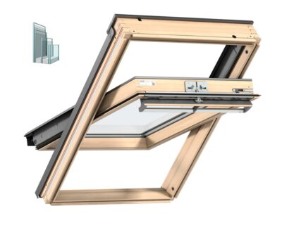 Finestra per tetti a falda Tripla Protezione in legno naturale, dotata di pratica apertura a bilico manuale; è venduta unitamente al raccordo in alluminio EDW, che garantisce la perfetta connessione tra il tetto e la finestra, alla cornice isolante BDX e al collare impermeabilizzante BFX.