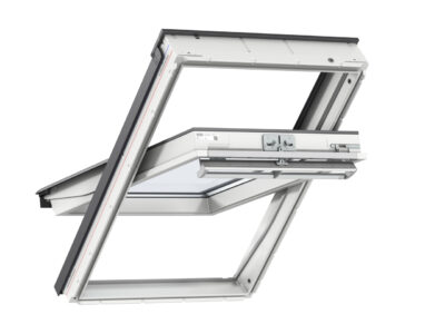 Finestra per tetti a falda GGU Velux in legno rivestito di poliuretano bianco, dotata di pratica apertura a bilico manuale; è venduta unitamente al raccordo EDW per manti di copertura sagomata in alluminio, che garantisce la perfetta connessione tra il tetto e la finestra, alla cornice isolante BDX e al collare impermeabilizzante BFX.