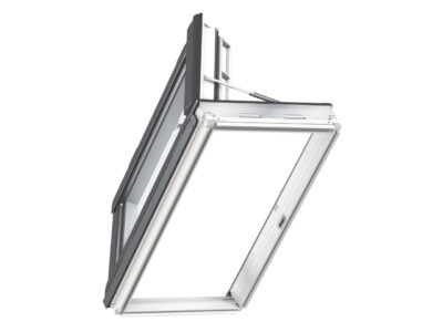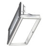 Finestra per linea vita Velux in legno bianca, con apertura a libro manuale. Grazie alla maniglia collocata a lato del battente consente un’apertura agevole, sicura e confortevole per l’accesso al tetto. E’ venduta unitamente al raccordo EDW per manti di copertura sagomata in alluminio che garantisce la perfetta connessione tra il tetto e la finestraal collare impermeabilizzante BFX.